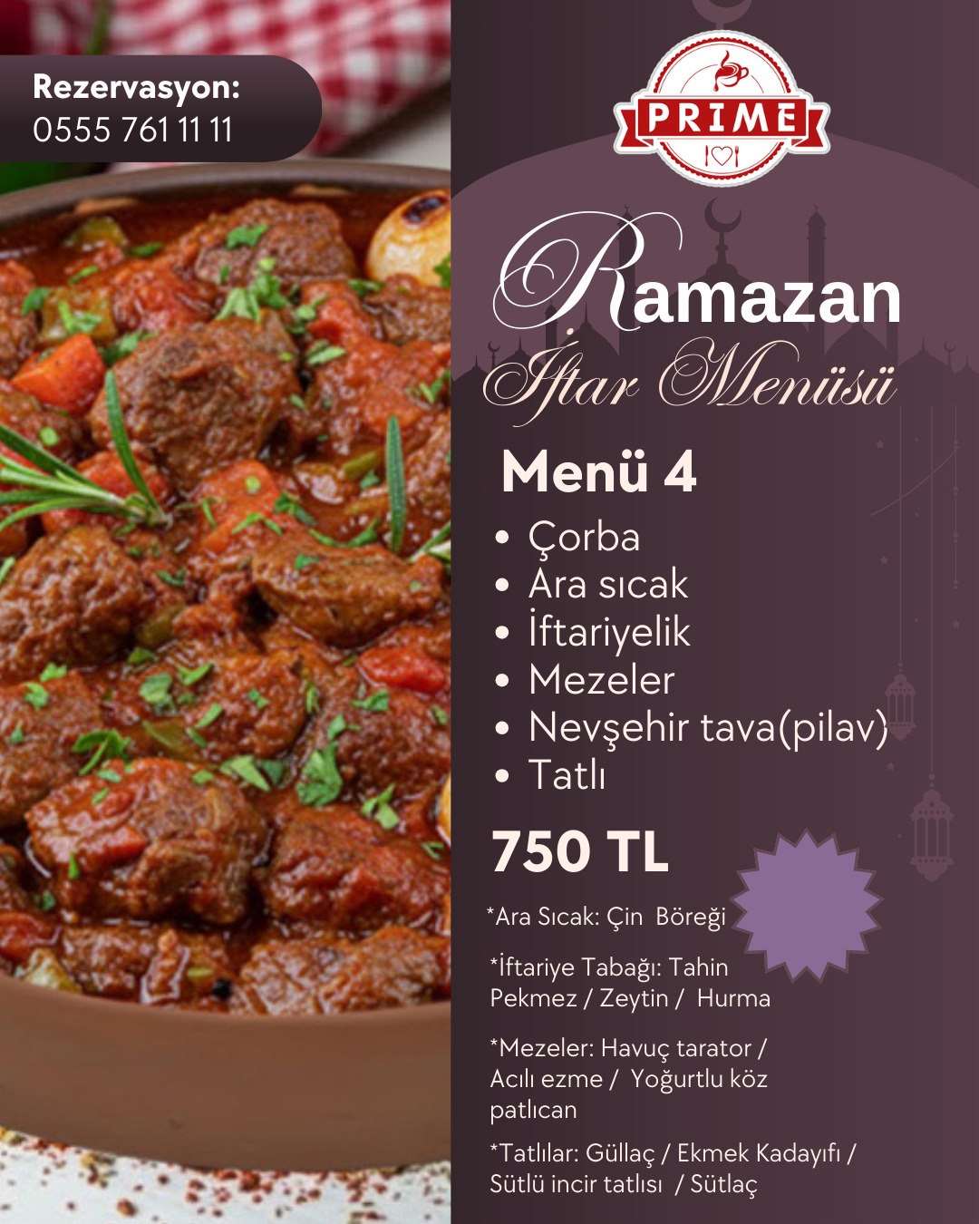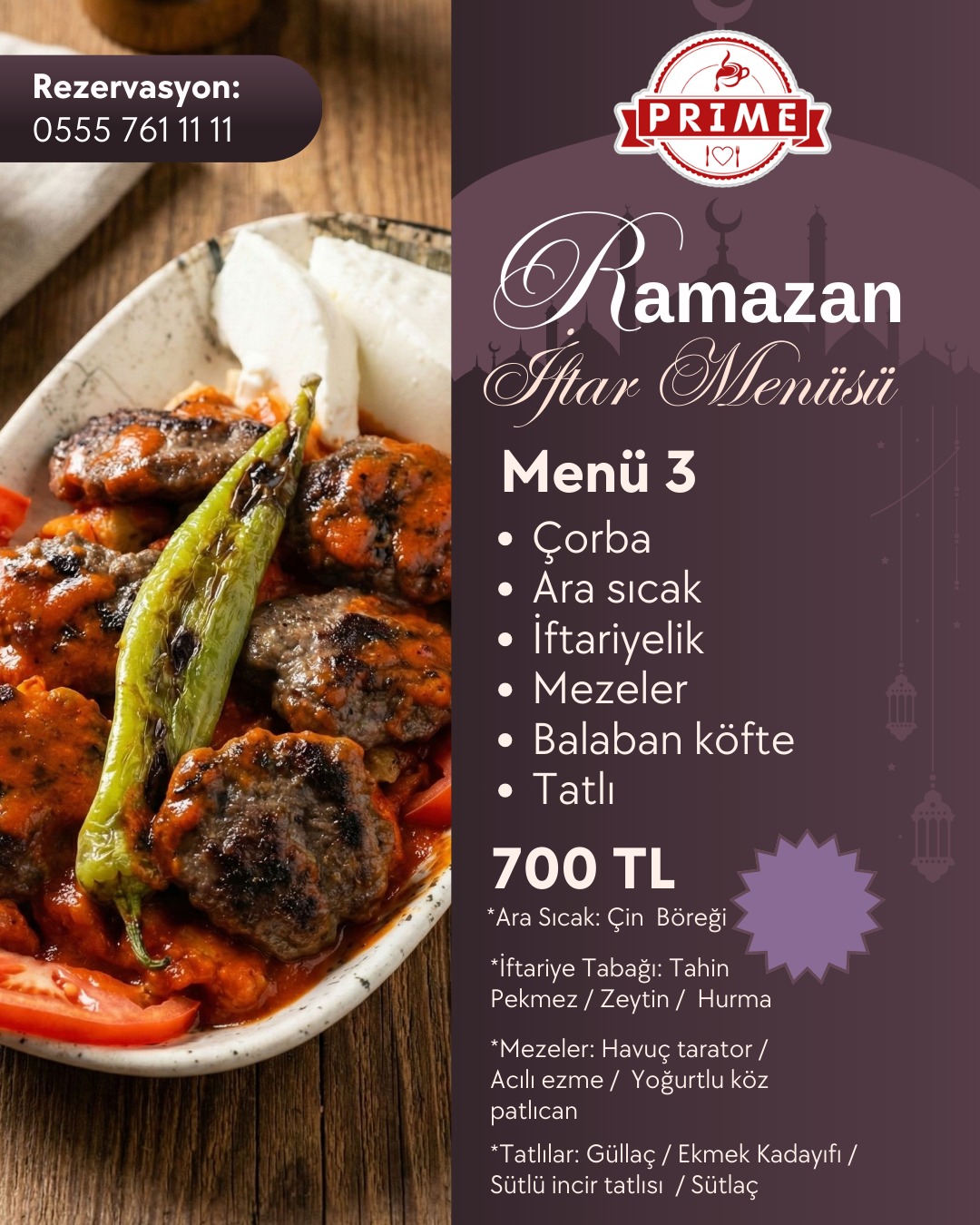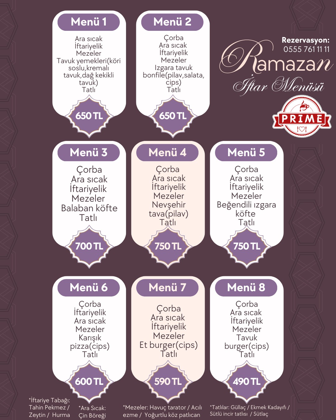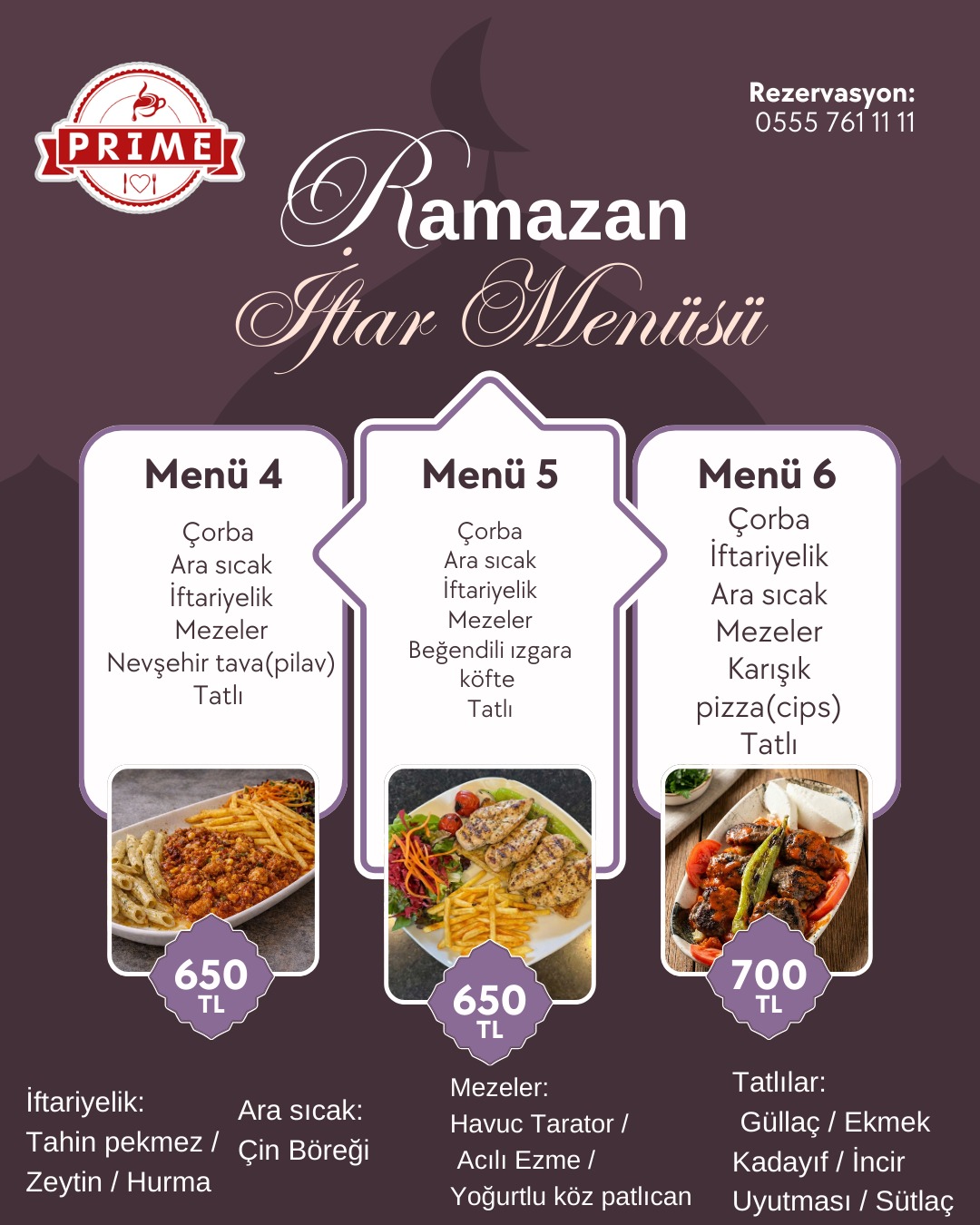 Tüm menülere; su, soğuk içecek, ara sıcak, iftar mezeleri ve tatlı ikramı dahildir.