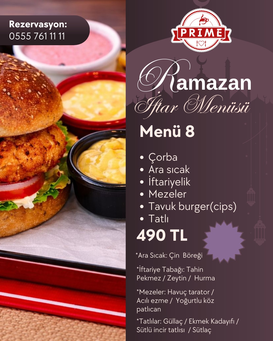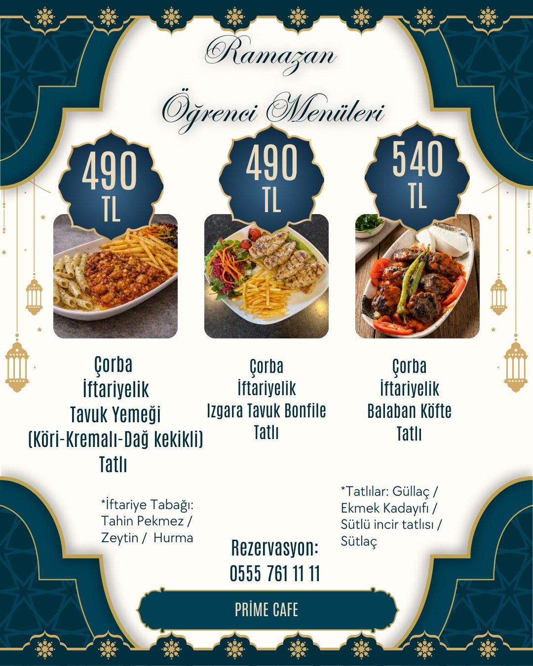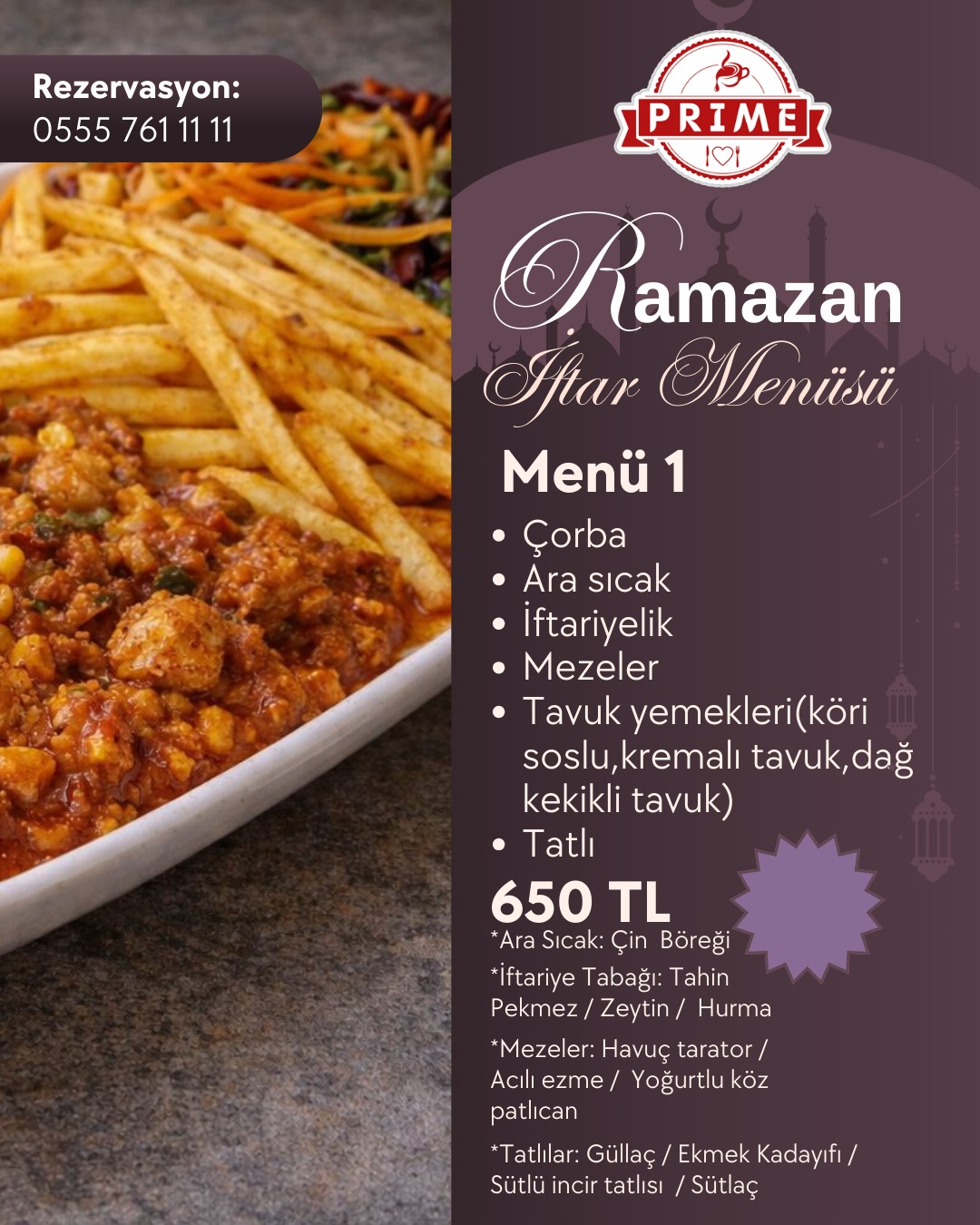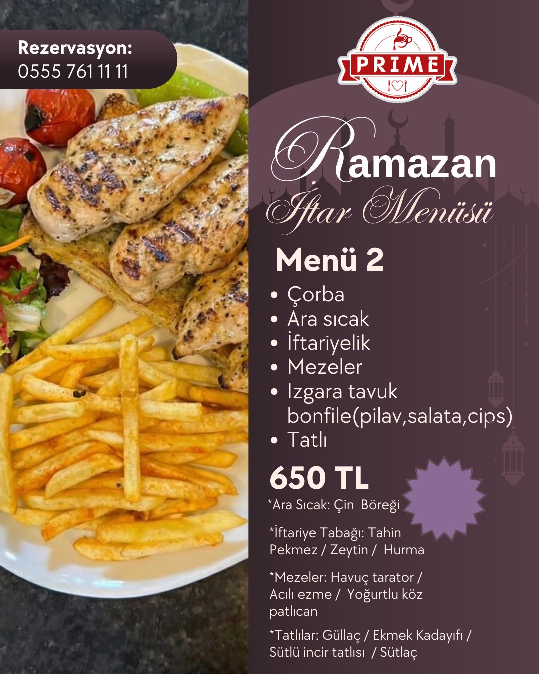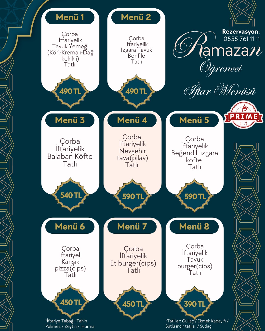 Tüm menülere; su, soğuk içecek, ara sıcak, iftar mezeleri ve tatlı ikramı dahildir.