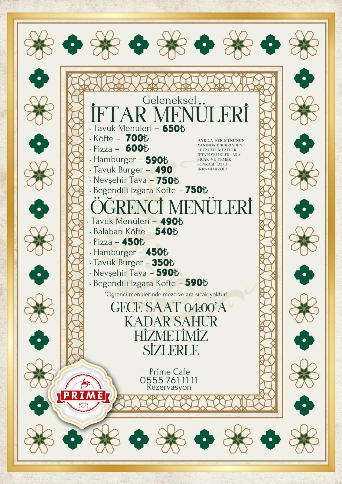 İftarın yanı sıra sahurda da kapılarını açık tutacak olan Prime Cafe, gece saatlerinde sıcak yemek ve içecek seçenekleriyle hizmet verecek. Sahurda dışarıda buluşmak isteyenler için serpme kahvaltı , gözleme ve çorba seçenekleri sunulacak.