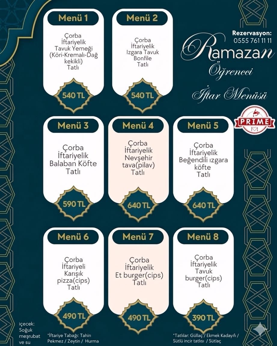 İşletmede ayrıca Balaban köfte, Nevşehir tava, tavuk ve pizza gibi birçok ana yemek seçeneğinin yer aldığı geleneksel iftar menüleri de bulunuyor. Prime Cafe’nin Ramazan boyunca sahur hizmetine de devam ettiği ve gece saat 04.00’e kadar açık olduğu belirtildi.