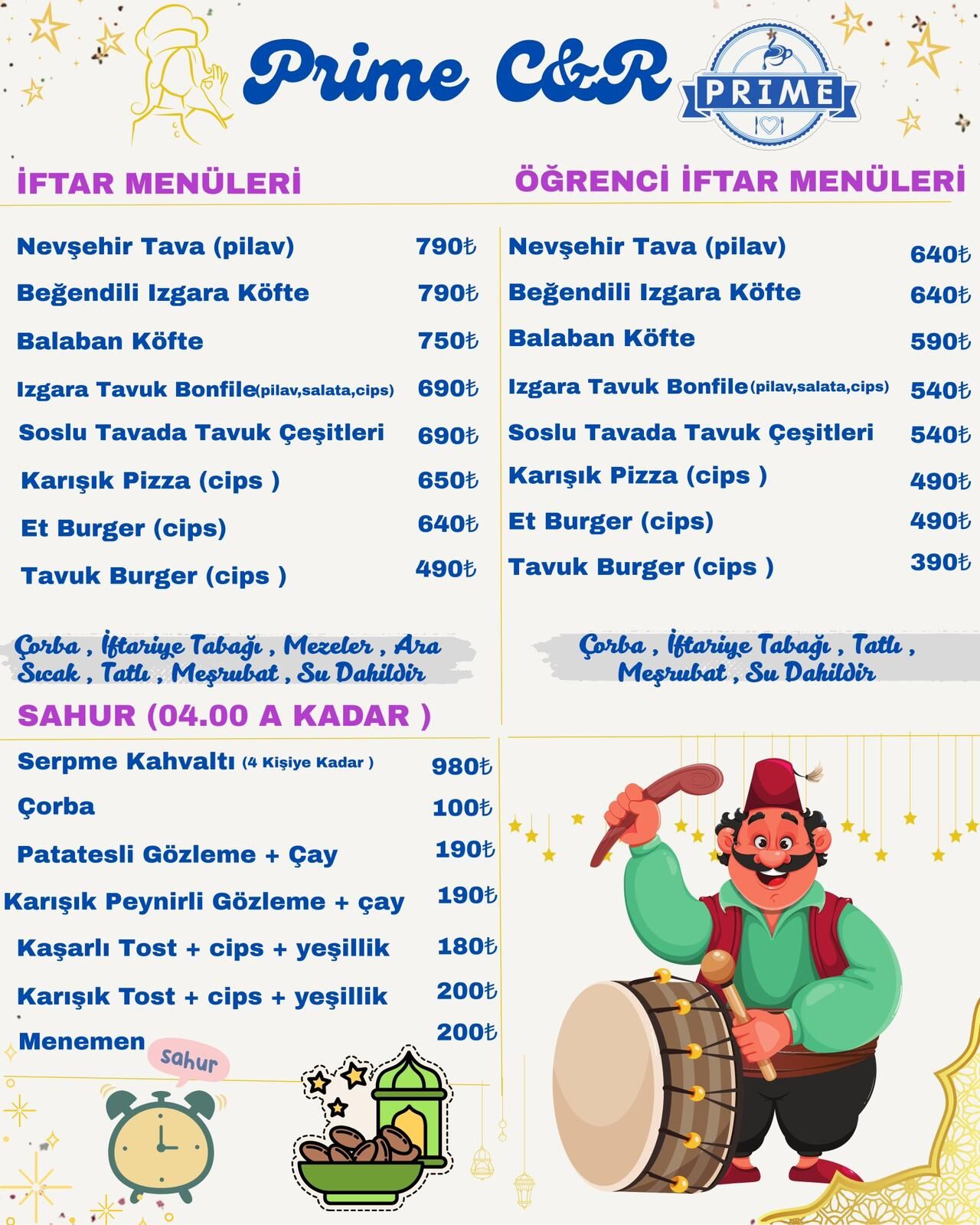 İşletmede ayrıca Balaban köfte, Nevşehir tava, tavuk ve pizza gibi birçok ana yemek seçeneğinin yer aldığı geleneksel iftar menüleri de bulunuyor. Prime Cafe’nin Ramazan boyunca sahur hizmetine de devam ettiği ve gece saat 04.00’e kadar açık olduğu belirtildi.