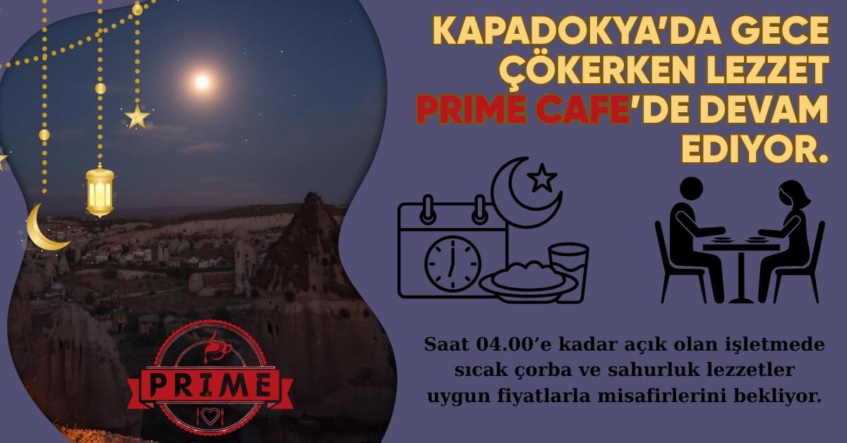 Kapadokya’da gün batarken iftar sofraları Prime Cafe’de kuruluyor, gece çökerken lezzet saat 04.00’e kadar devam ediyor. Uygun iftar menüleriyle dikkat çeken işletme, sahur saatlerine kadar sıcak çorba ve uygun fiyatlı lezzetleriyle misafirlerini ağırlamayı sürdürüyor. Prime Cafe, Ramazan boyunca hem iftarda hem sahurda Nevşehir’in buluşma noktası olmaya devam ediyor.
