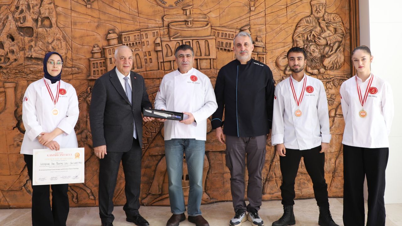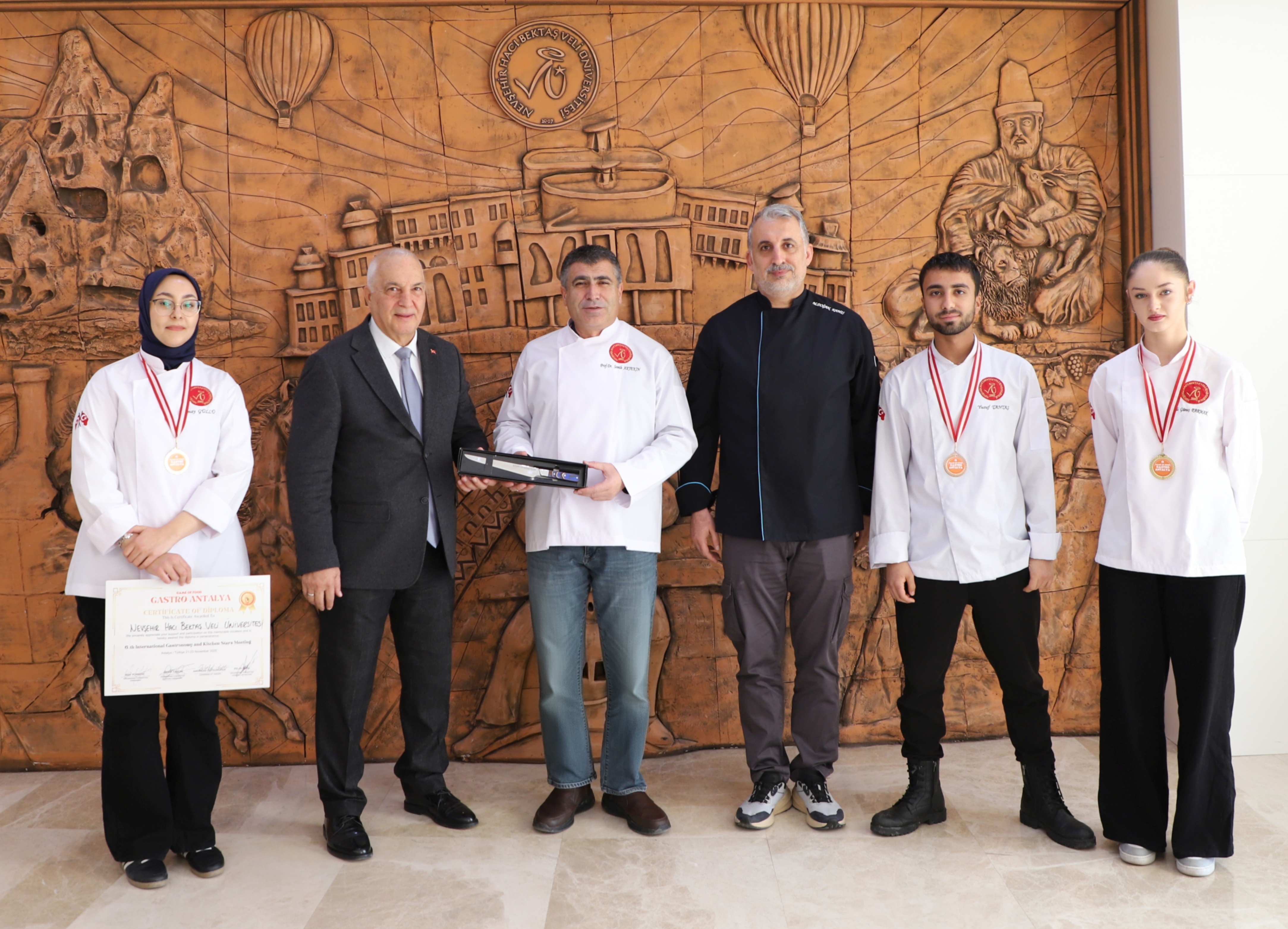 Nevşehir Hacı Bektaş Veli Üniversitesi (NEVÜ) Rektörü Prof. Dr. Semih Aktekin, “Gastro Antalya 2025” yarışmasında önemli bir başarıya imza atan Ürgüp Sebahat ve Erol Toksöz Turizm Meslek Yüksekokulu (ÜSETT MYO) Aşçılık Bölümü öğrencilerini makamında kabul ederek tebrik etti.