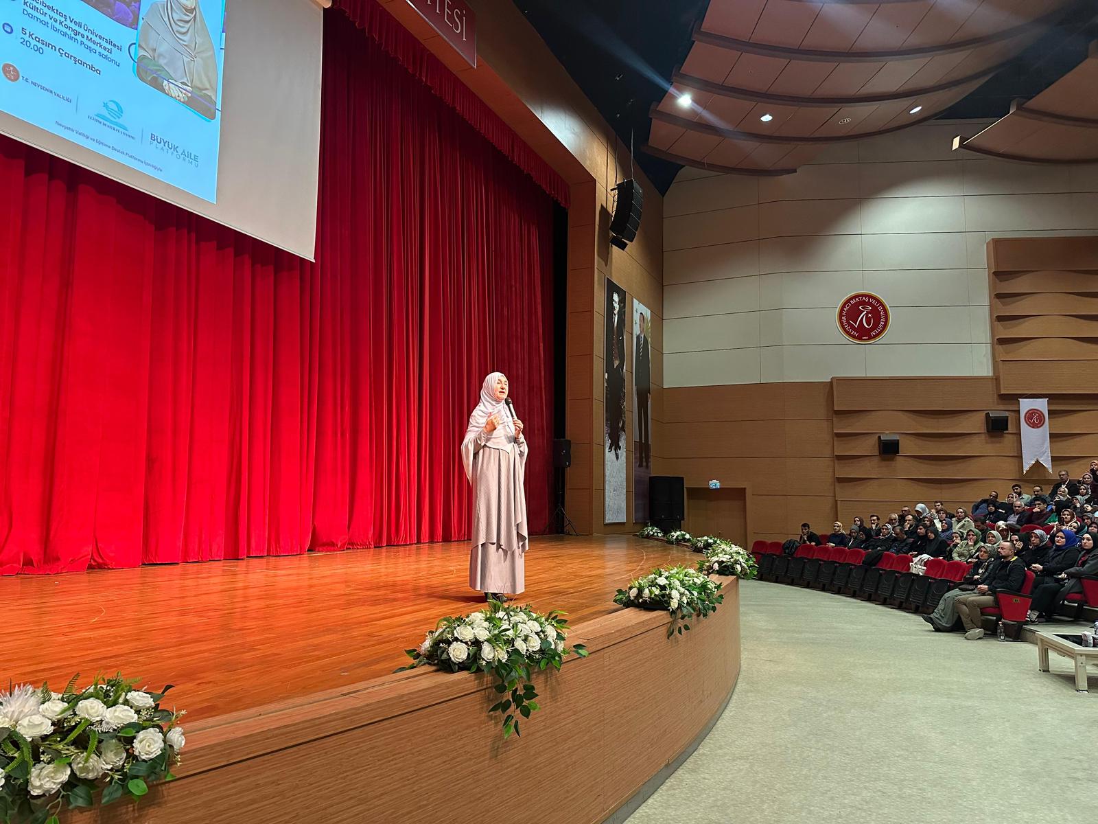 Damat İbrahim Paşa Salonu’nu dolduran katılımcıların büyük bir dikkatle takip ettiği konferans, Saliha Erdim’in aile kurumunu güçlendirmeye yönelik yaptığı çağrılarla sona erdi.