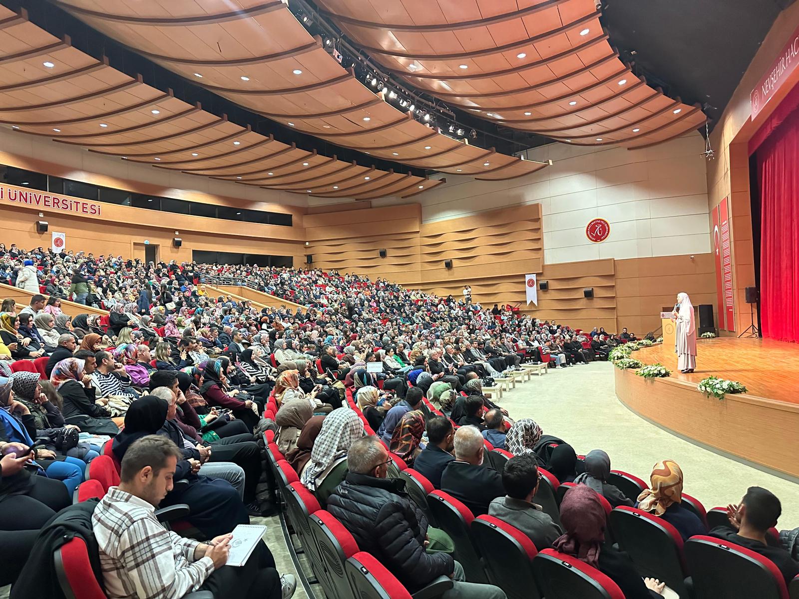 Aile içi iletişim, eşler arası uyum ve ebeveyn-çocuk ilişkileri gibi konulara değinen Erdim, aile mutluluğunun ve toplumsal huzurun temellerinin sağlam aile yapısından geçtiğini belirtti. Konuşmasında manevi değerlerin ve bireysel farkındalığın aile hayatındaki yerine dikkat çeken Saliha Erdim, dinleyicilere pratik tavsiyelerde bulundu.