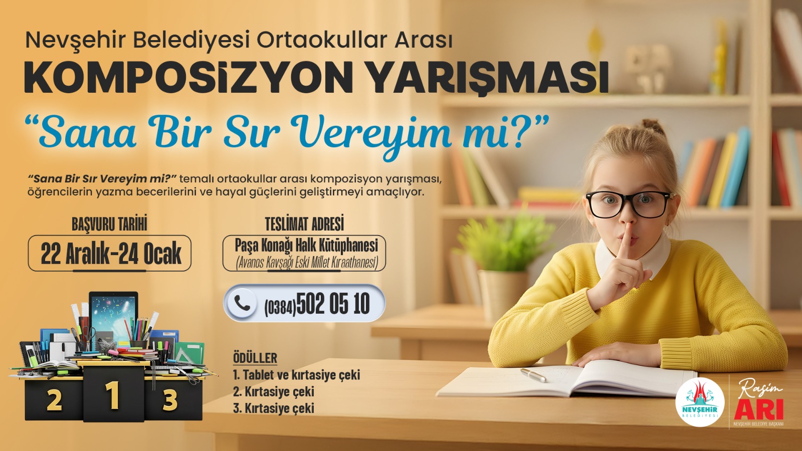 Nevşehir Belediyesi tarafından Ortaokullar arası “Sana Bir Sır Vereyim mi?” temalı kompozisyon yarışması düzenlenecek. Nevşehir Belediyesi Gençlik ve Spor Hizmetleri Müdürlüğü tarafından yapılacak Kompozisyon yarışmasına Ortaokul öğrencileri katılacak.