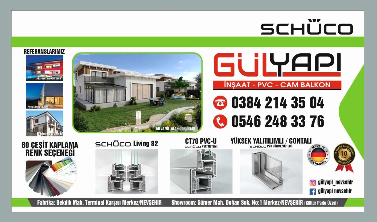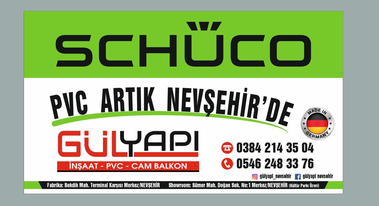 Gülyapı İnşaat, Bekdik Mahallesi, Terminal Karşısı, Merkez/Nevşehir adresindeki fabrikasında Schüco markalı PVC sistemlerin üretimini gerçekleştiriyor. Ayrıca, müşterilerin ürünleri yakından görüp inceleyebileceği showroom, Sümer Mahallesi, Doğan Sokak No:1, Merkez/Nevşehir (Kültür Parkı Üzeri) adresinde hizmet veriyor.