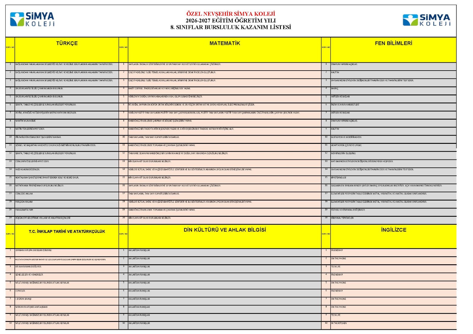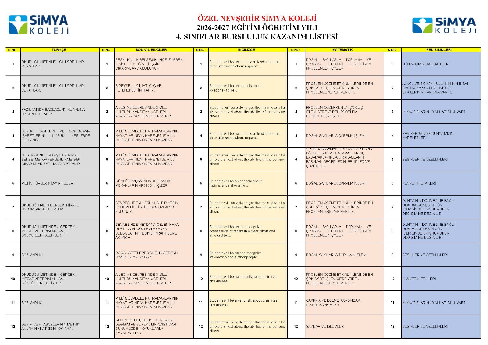 “Eğitimin Parlayan Yıldızı, Beklentilerin İdeal Çözümü” sloganıyla eğitimde fark oluşturan Simya Koleji 11 Ocak 2026 Pazar günü saat 10.00'da 4. sınıflara, saat 14.00'te ise 8. sınıflara yapacağı Bursluluk Sınavı’na ait kazanımlarını ve 2026-2027 Eğitim Öğretim yılı bursluluk sınavı sonuçlarına göre öğrencilere vereceği burs oranları yayınladı.