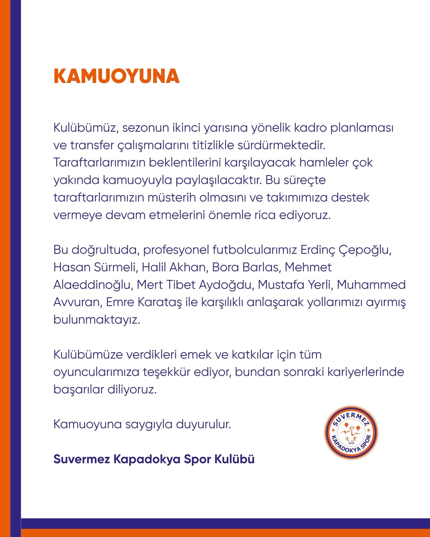 Bu kapsamda, profesyonel futbolcular Erdinç Çepoğlu, Hasan Sürmeli, Halil Akhan, Bora Barlas, Mehmet Alaeddinoğlu, Mert Tibet Aydoğdu, Mustafa Yerli, Muhammed Avvuran ve Emre Karataş ile karşılıklı anlaşarak yollar ayrıldı. Kulüp, oyunculara verdikleri emek ve katkılar için teşekkür ederken, kariyerlerinin bundan sonraki döneminde başarılar diledi.