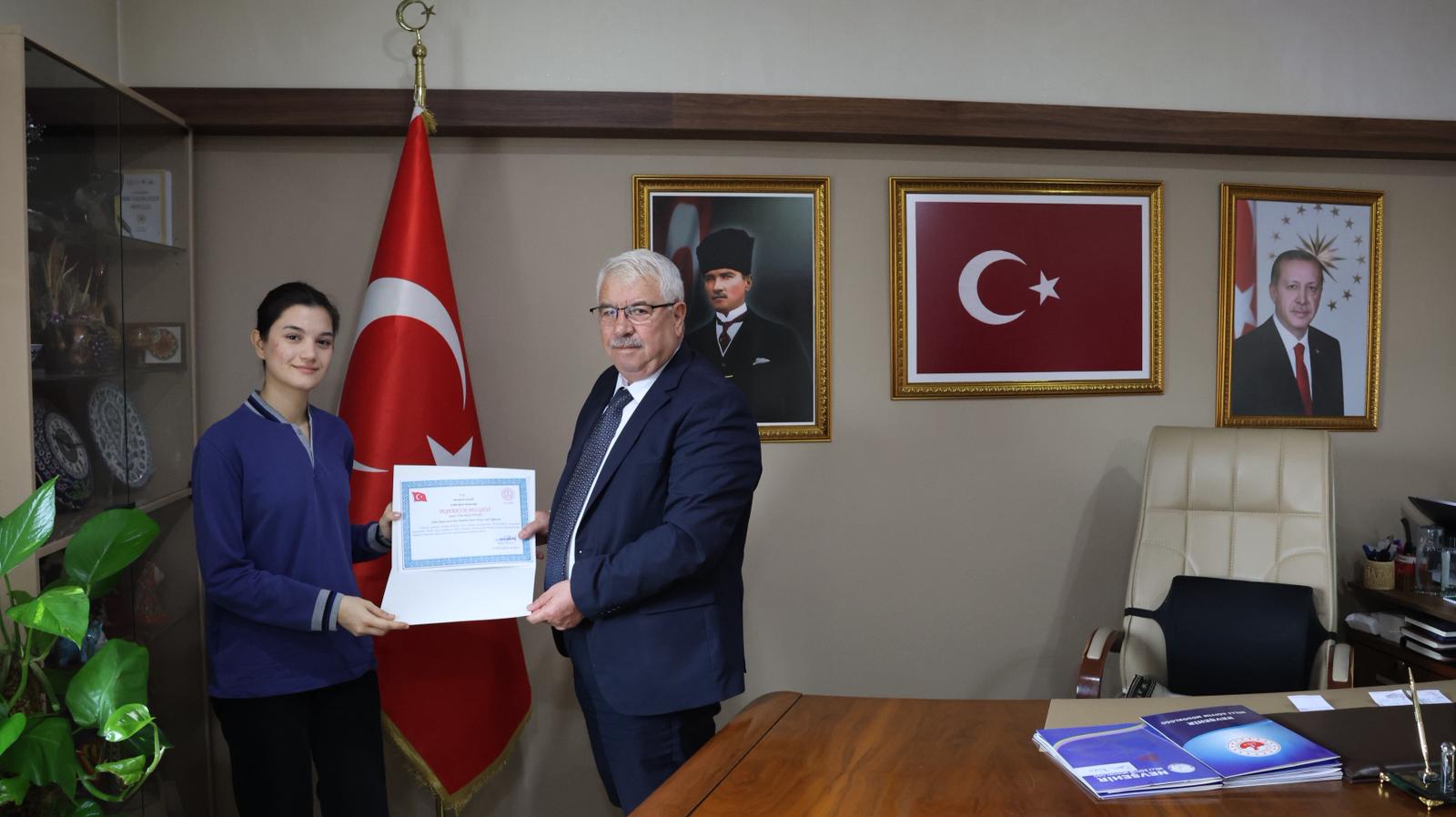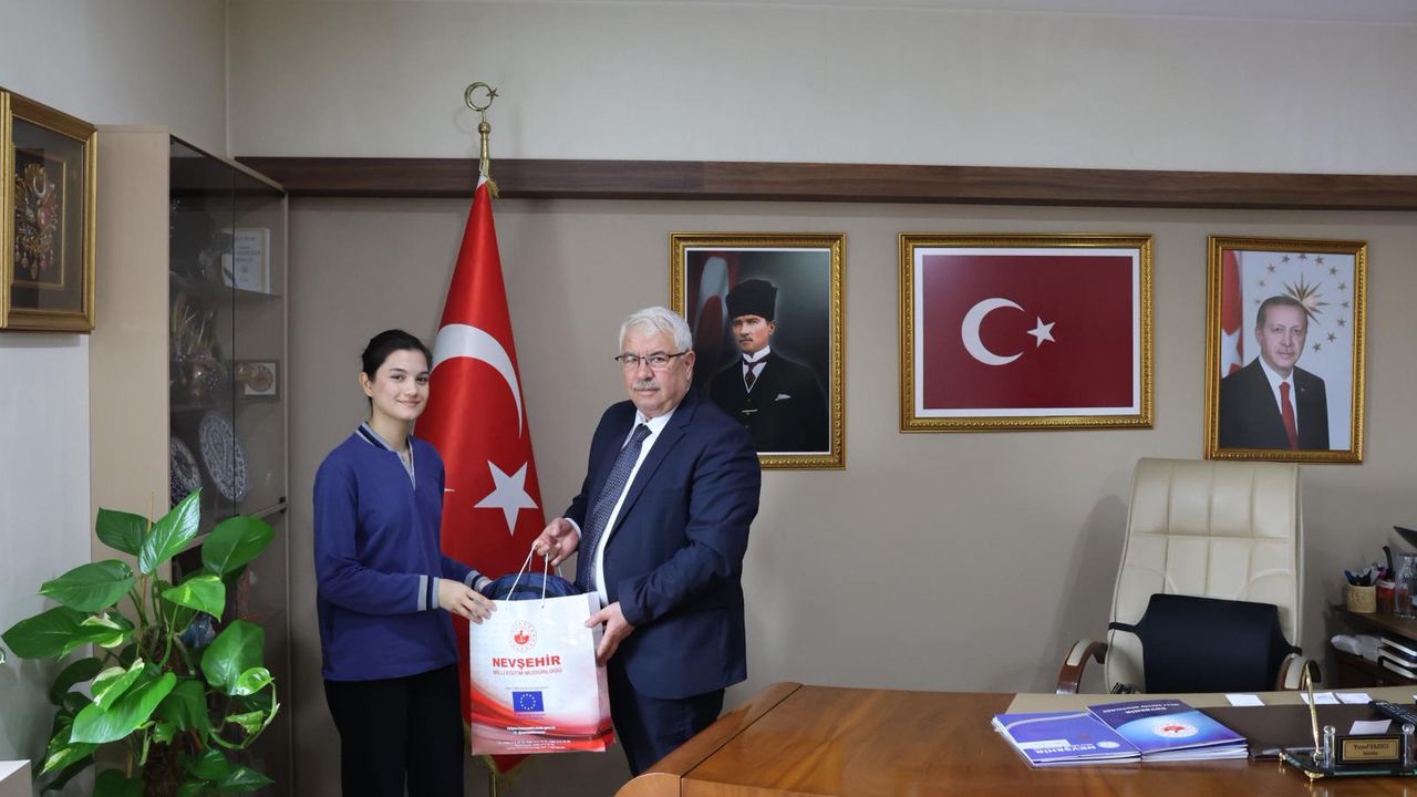 TEKNOFEST 2025’te, yüksek teknik donanım ve keskin bir zekâ gerektiren “Pardus Hata Yakalama ve Öneri Yarışması” kategorisinde finale kalarak Nevşehir'i gururlandıran Nevşehir Şehit Demet Sezen Kız Anadolu İmam Hatip Lisesi öğrencisi Zehra Betül Yüksel ve okul müdürü Mustafa Kılınç, İl Millî Eğitim Müdürü Yusuf Yazıcı’yı ziyaret ettiler.
