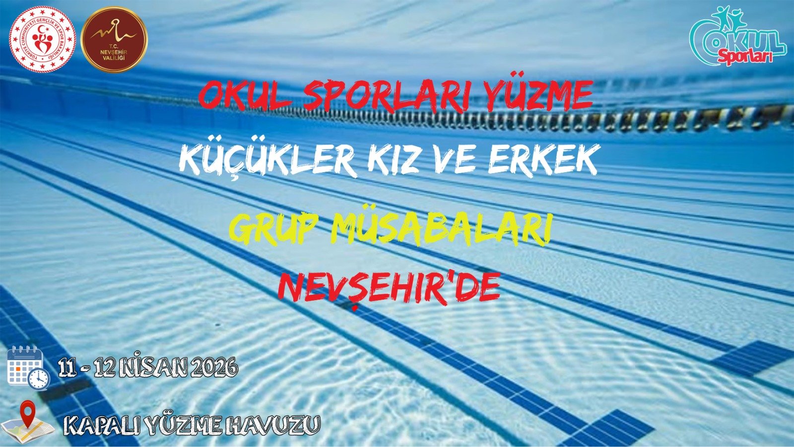 Spor Hizmetleri Genel Müdürlüğü Okul Sporları Daire Başkanlığı’nın 2025-2026 Eğitim-Öğretim Yılı faaliyet programı kapsamında düzenlenen Okul Sporları Yüzme Küçükler (Kız-Erkek) Grup Müsabakaları, 11-12 Nisan 2026 tarihleri arasında Nevşehir’de gerçekleştirilecek.
