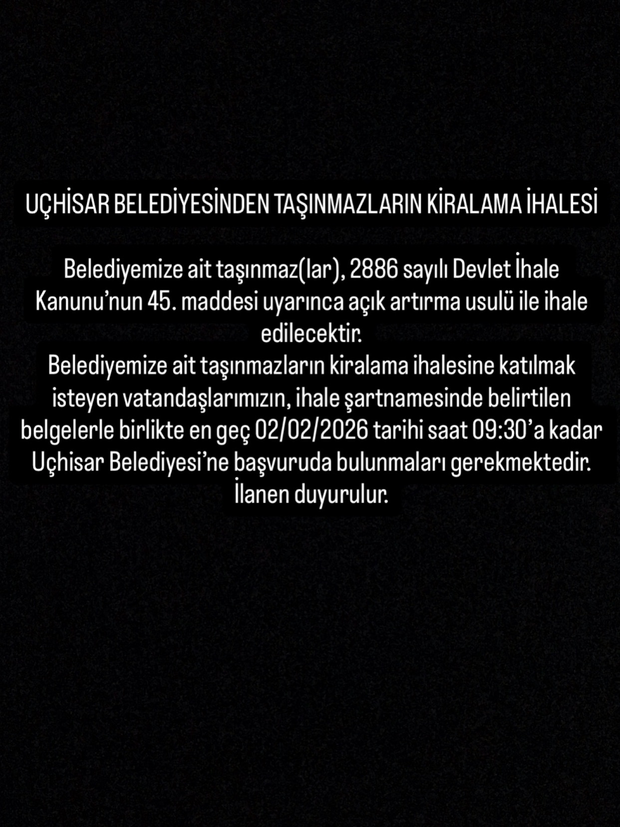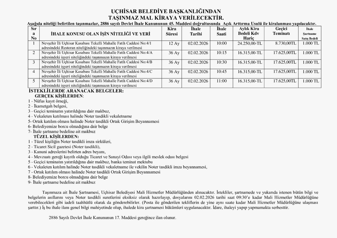 Uçhisar Belediyesi mülkiyetinde bulunan taşınmazlar, 2886 sayılı Devlet İhale Kanunu’nun 45. maddesi kapsamında açık artırma usulüyle kiraya verilecek. Belediye tarafından yapılan duyuruya göre, kiralama ihalesi 2 Şubat 2026 Pazartesi günü gerçekleştirilecek.