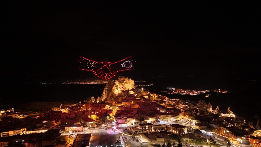 Kapadokya’da düzenlenen Çin At Yılı Festivali etkinlikleri kapsamında Uçhisar’da gerçekleştirilen drone gösterisi, izleyenlere unutulmaz bir gece yaşattı. Uçhisar Meydanı’nda yapılan etkinlikte yüzlerce kişi gökyüzündeki ışık koreografilerini ilgiyle takip etti.