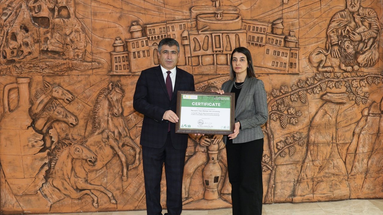 Nevşehir Hacı Bektaş Veli Üniversitesi (NEVÜ), dünya üniversitelerini çevre duyarlılığı ve sürdürülebilirlik kriterlerine göre değerlendiren uluslararası UI GreenMetric sıralamasına ilk kez katılarak önemli bir başarı elde etti. UI GreenMetric tarafından üniversiteye gönderilen ödül belgesi, Rektör Prof. Dr. Semih Aktekin’e takdim edildi.