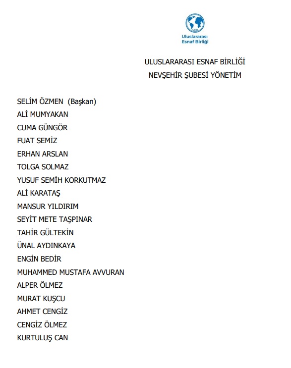 ULUSLARARASI ESNAF BİRLİĞİ NEVŞEHİR ŞUBESİ YÖNETİM