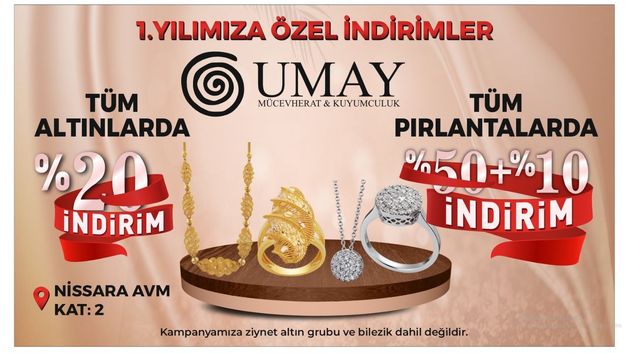 Nevşehir’de faaliyet gösteren Umay Mücevherat & Kuyumculuk, kuruluşunun 1. yılı şerefine müşterilerine özel indirim fırsatları sunuyor. Nissara AVM’deki mağazasında düzenlenen kampanya kapsamında tüm altın ürünlerinde %20 indirim, Tüm pırlanta ürünlerinde %50 + %10 indirim fırsatları uygulanıyor.