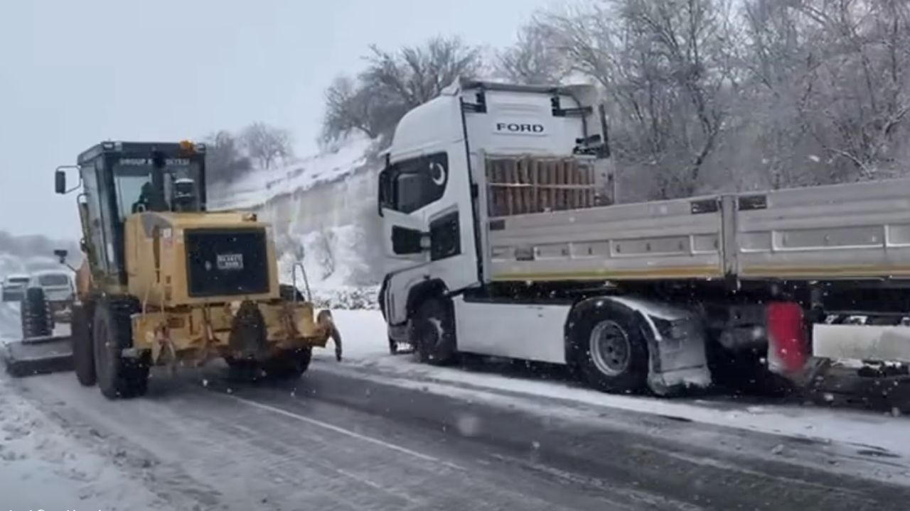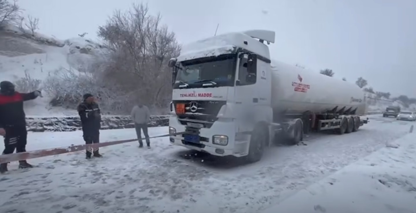 Nevşehir’in Ürgüp ilçesinde yoğun kış şartları nedeniyle çevre yolunda yolda kalan bir tıra, Ürgüp Belediyesi ekipleri tarafından hızlı şekilde müdahale edildi. Kaygan zemin nedeniyle kontrolden çıkarak yolu trafiğe kapatan tanker, ekiplerin çalışmasıyla kısa sürede bulunduğu yerden kurtarıldı ve yol yeniden ulaşıma açıldı.
