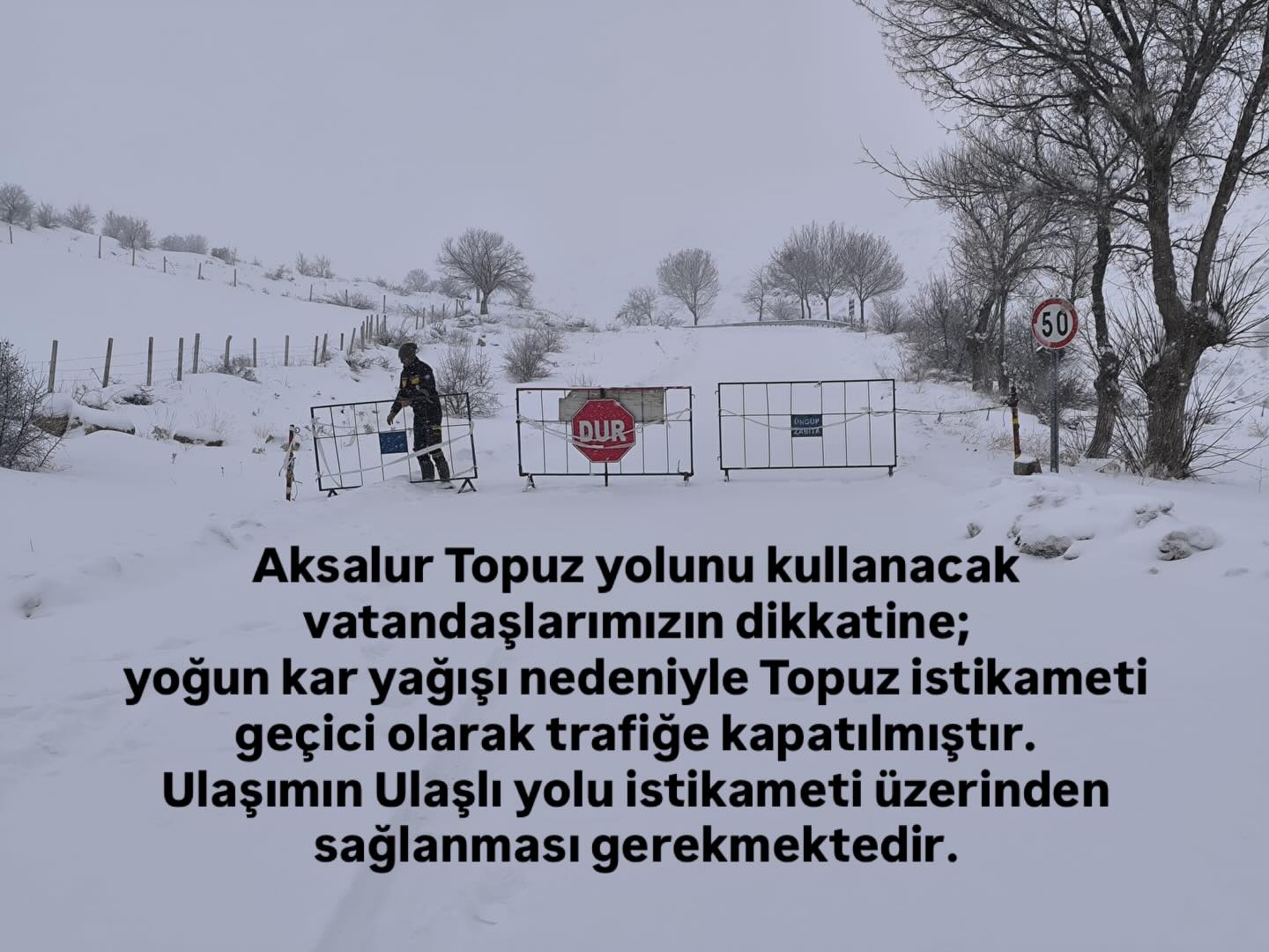 Yetkililer, Aksalur–Topuz yolunu kullanacak sürücülerin ulaşımlarını Ulaşlı yolu istikameti üzerinden sağlamaları gerektiğini bildirdi. Bölgedeki ekiplerin yol açma ve kar temizleme çalışmalarını sürdürdüğü, hava şartlarının normale dönmesiyle birlikte yolun yeniden trafiğe açılacağı ifade edildi.