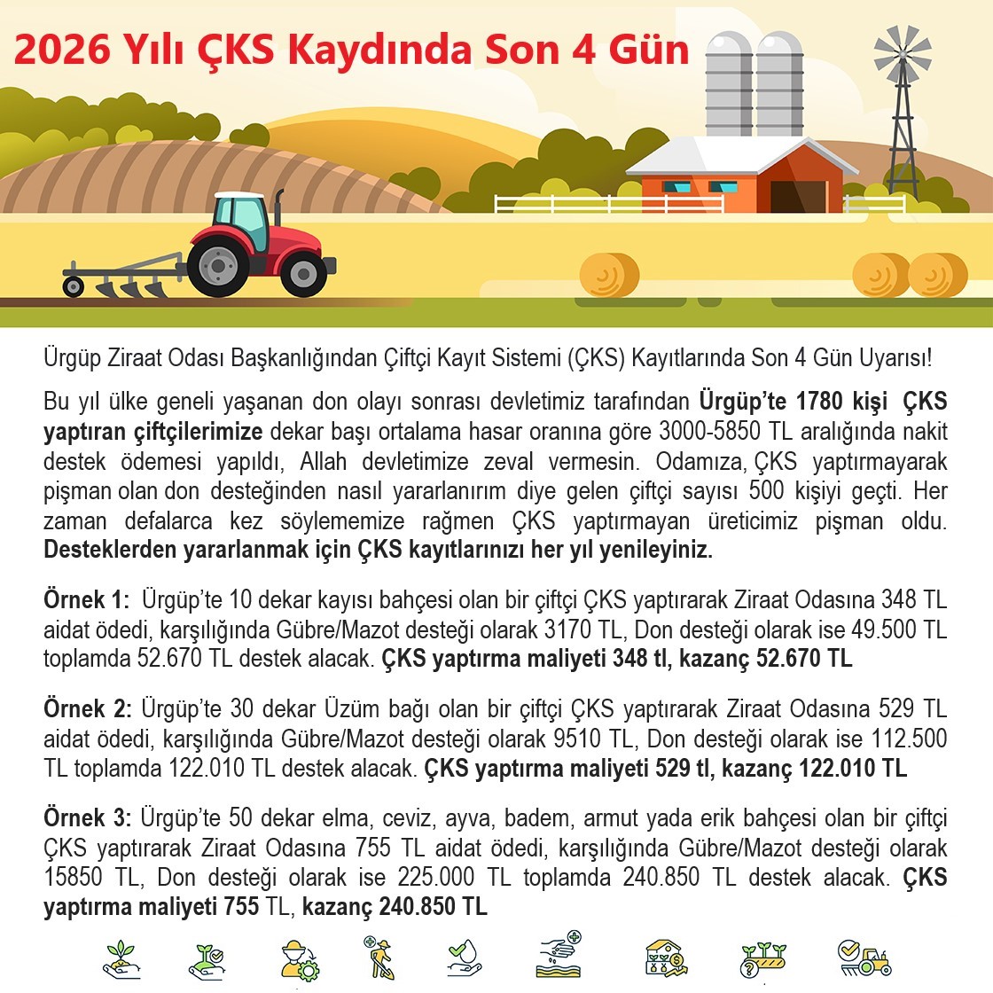 Ürgüp Ziraat Odası Başkanlığı, 2026 Yılı Çiftçi Kayıt Sistemi (ÇKS) başvuruları için son 4 gün kaldığını belirterek çiftçilere önemli bir uyarıda bulundu.