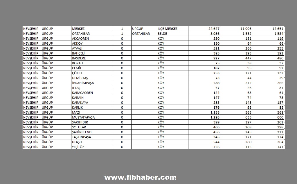 İşte Ürgüp ilçesinin belde ve köylerinin 2022 nüfusları: