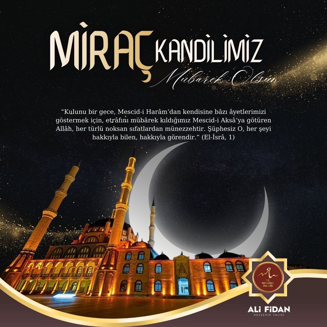Nevşehir Valisi Ali Fidan, Miraç Kandili dolayısıyla yayımladığı mesajında, Miraç’ın insanlık için taşıdığı derin manaya dikkat çekerek, bu mübarek gecenin birlik, beraberlik ve kardeşlik duygularını güçlendirmesini temenni etti.