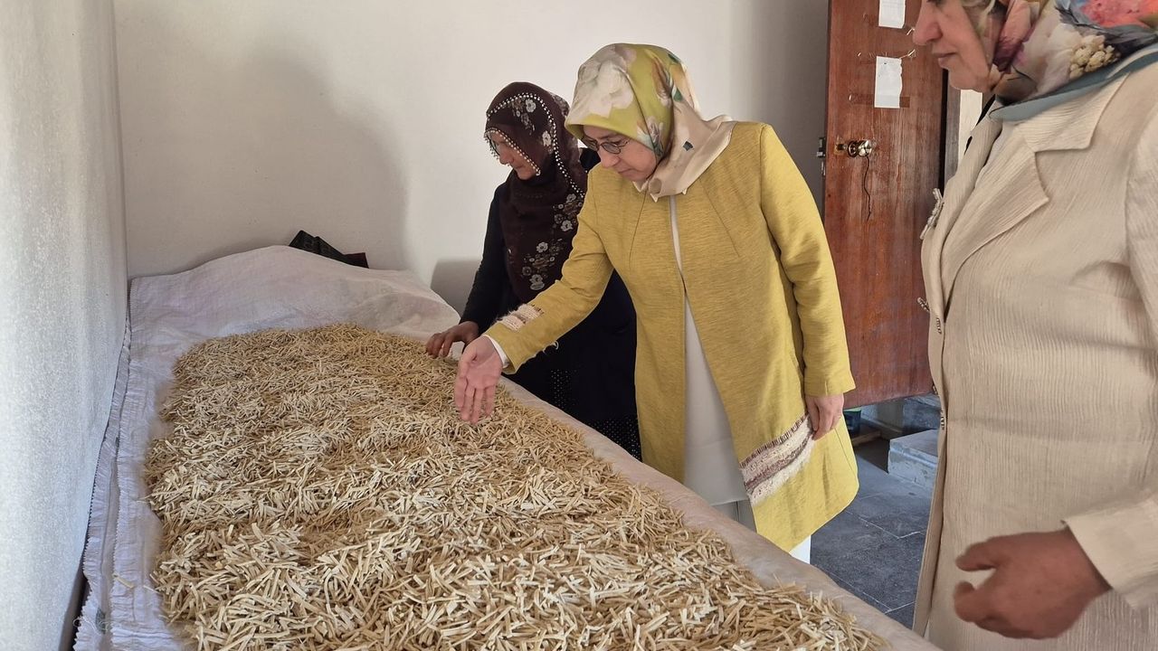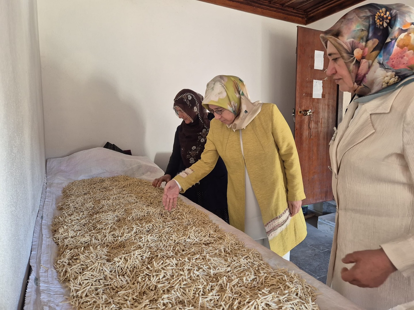 Kadınların el emeğiyle hazırladığı yöresel ürünler, kışlık erişte, makarna, turşu acılı ve mantar üretimi yapılan tesisleri yerinde inceleyen Prof. Dr. Fidan, kadın emeğiyle oluşturulan üretim sürecini yakından gözlemledi.