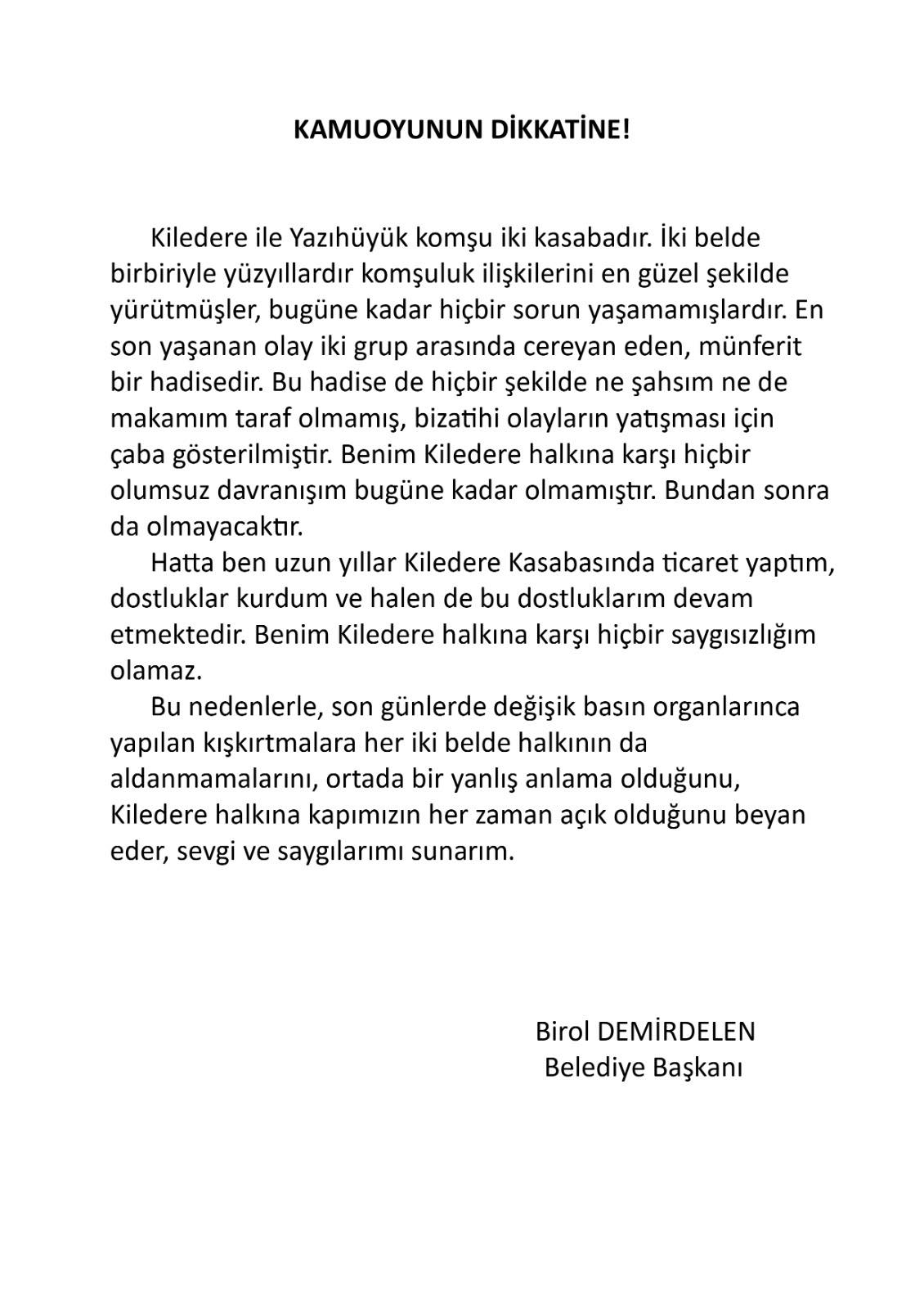 Yazıhüyük Belediye Başkanı Birol Demirdelen, son günlerde Yazıhüyük ve Kiledere beldeleri arasında yaşanan gelişmelere ilişkin kamuoyunu bilgilendirmek amacıyla sosyal medya hesabından dikkat çeken bir açıklama yaptı.