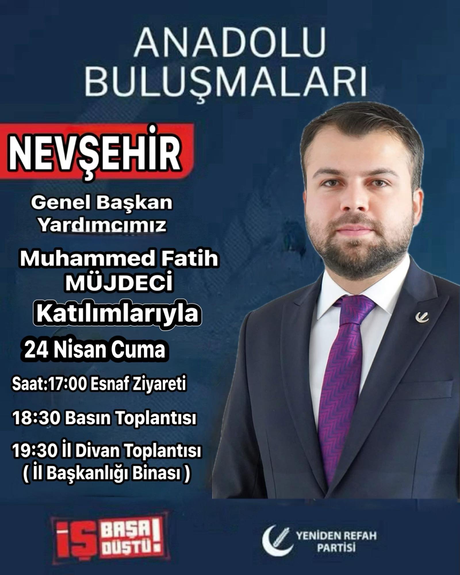 Yeniden Refah Partisi Nevşehir İl Başkanı Abdulgani Altınışık, yaptığı açıklamada Genel Başkan Yardımcısı Muhammed Fatih Müjdeci’nin katılımıyla bir dizi etkinlik gerçekleştirileceğini duyurdu.