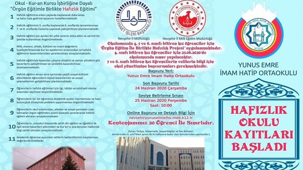 Nevşehir Yunus Emre İmam Hatip Ortaokuluna Hafızlık Sınıfı Sınavı için kayıtlar başladı.